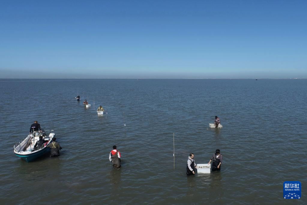 唐山祥云湾海洋牧场的技术人员在海草种植试验区播种鳗草种子(2021年10月12日摄)。