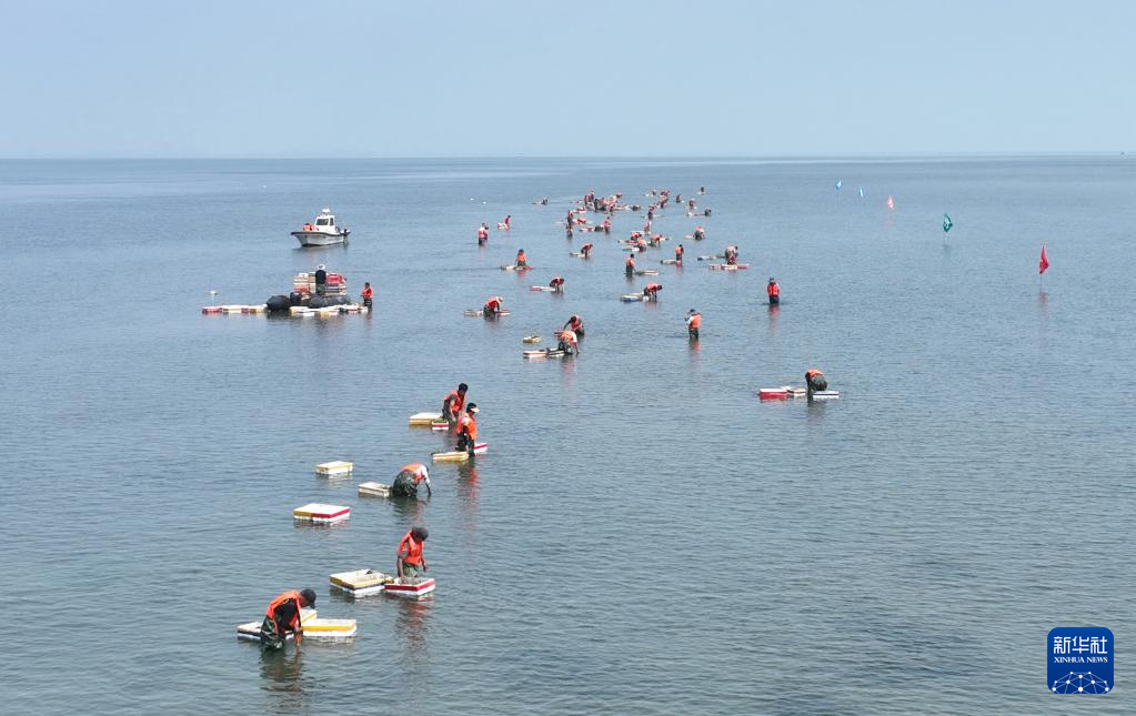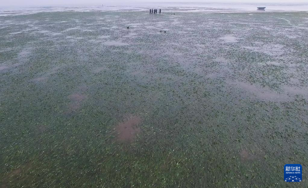 6月25日,中船环境集团的工人在唐山市曹妃甸区海洋生态保护与修复项目鳗草苗采集海域工作(无人机照片)。