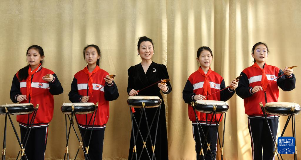 传承人李雪(中)带领学生演唱西河大鼓。新华社发(苑立伟摄)