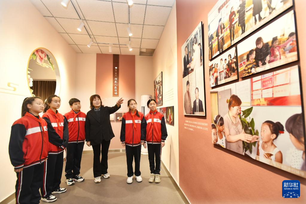 传承人张领娣(右三)在河间市非遗传习所为学生讲解西河大鼓知识。新华社发(苑立伟摄)