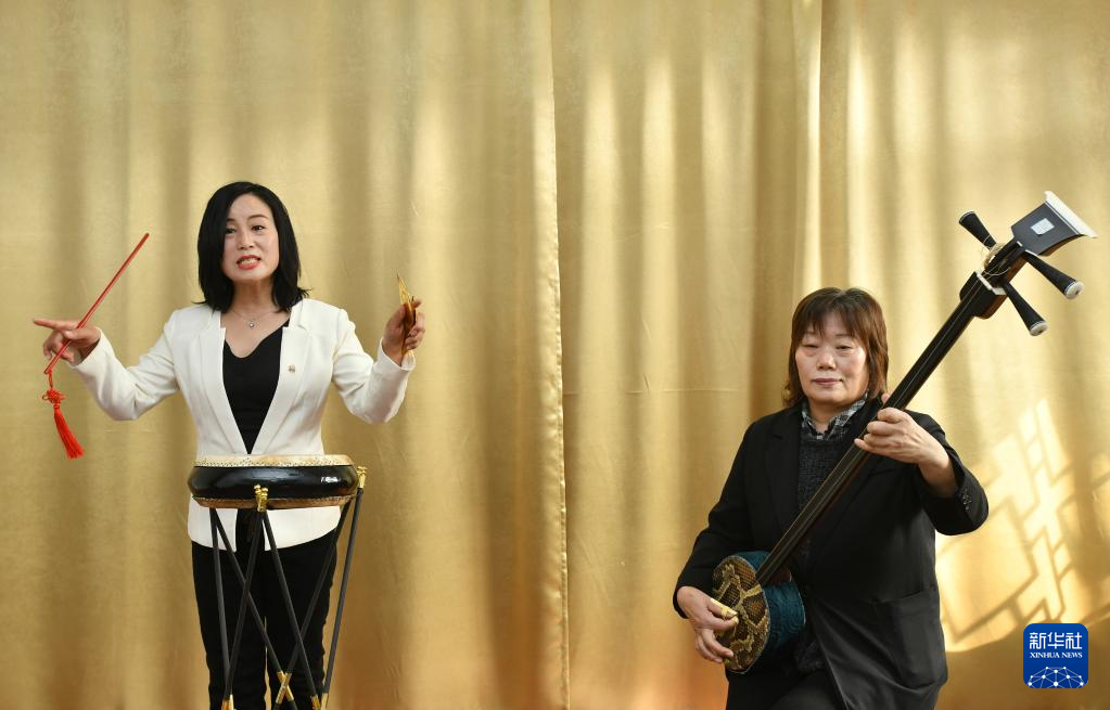 西河大鼓传承人张领娣(右)为青年演员伴奏。新华社发(苑立伟摄)