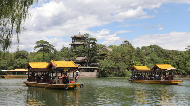 7月8日,游客乘船在河北承德避暑山庄游览。