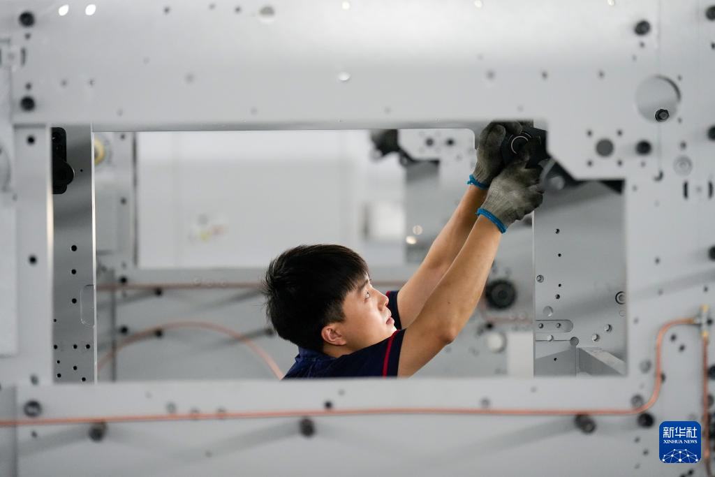 7月13日,河北省玉田县一家印刷包装机械制造企业的工人在安装产品零部件。