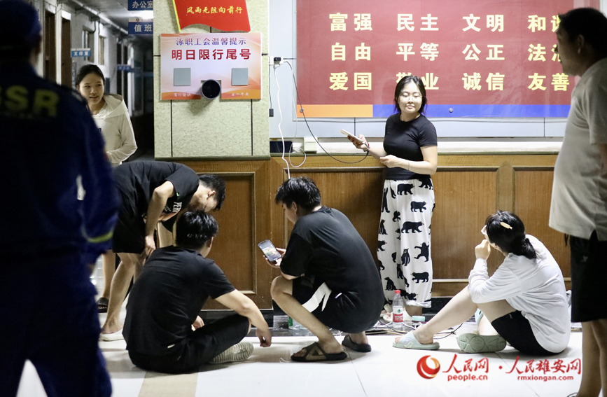 8月1日晚间,涿州市职教中心安置点内,一群年轻人正在共享电源为自己的手机充电。人民网记者 宋烨文摄