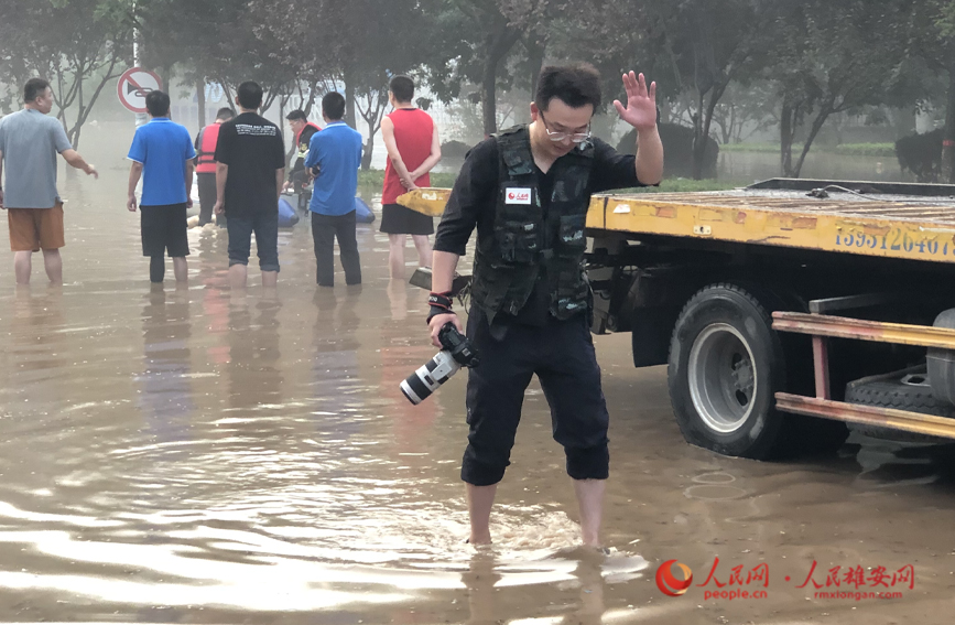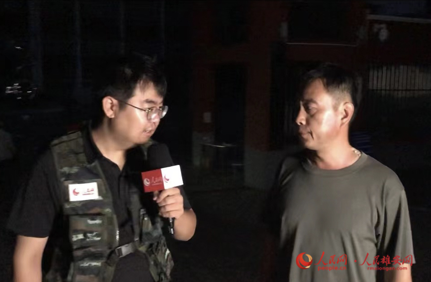 人民网记者在防汛救灾一线进行采访。人民网 宋烨文摄