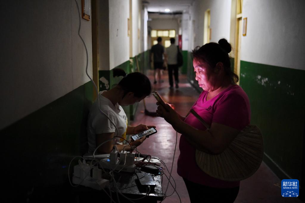 8月1日,安置群众在河北省涿州市职教中心安置点内给手机充电。