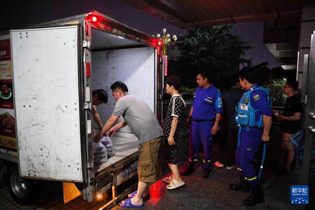 8月1日,河北省涿州市职教中心安置点的工作人员在运送饭菜,准备发放给安置群众。