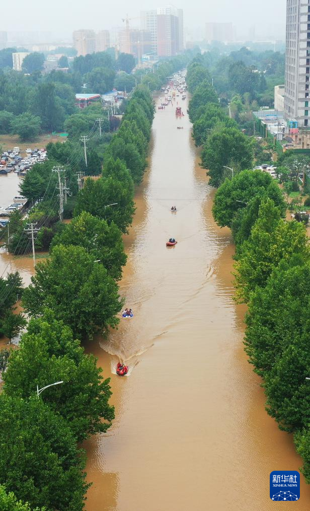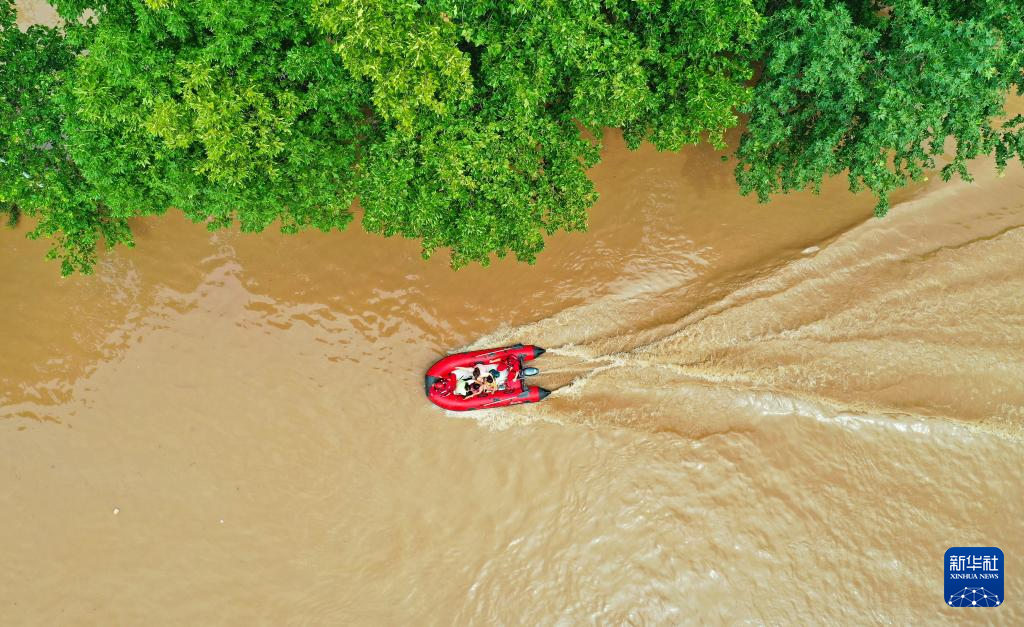 8月2日,救援人员在河北省涿州市市区乘坐冲锋舟前去转移受灾群众(无人机照片)。