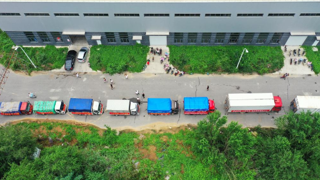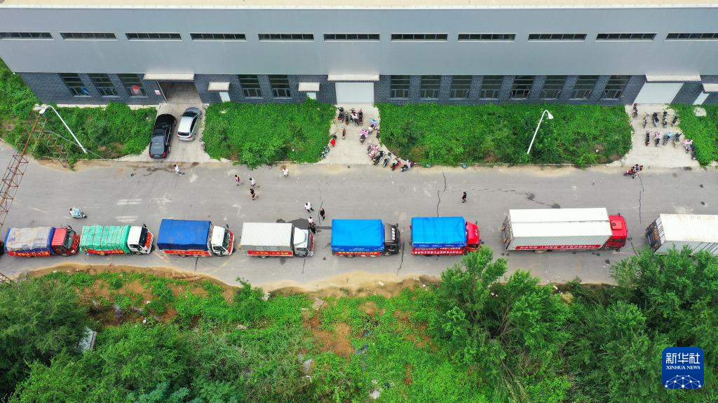 8月5日,在河北省涿州市钢研物资储备点外,运送物资的车辆排起了长队(无人机照片)。