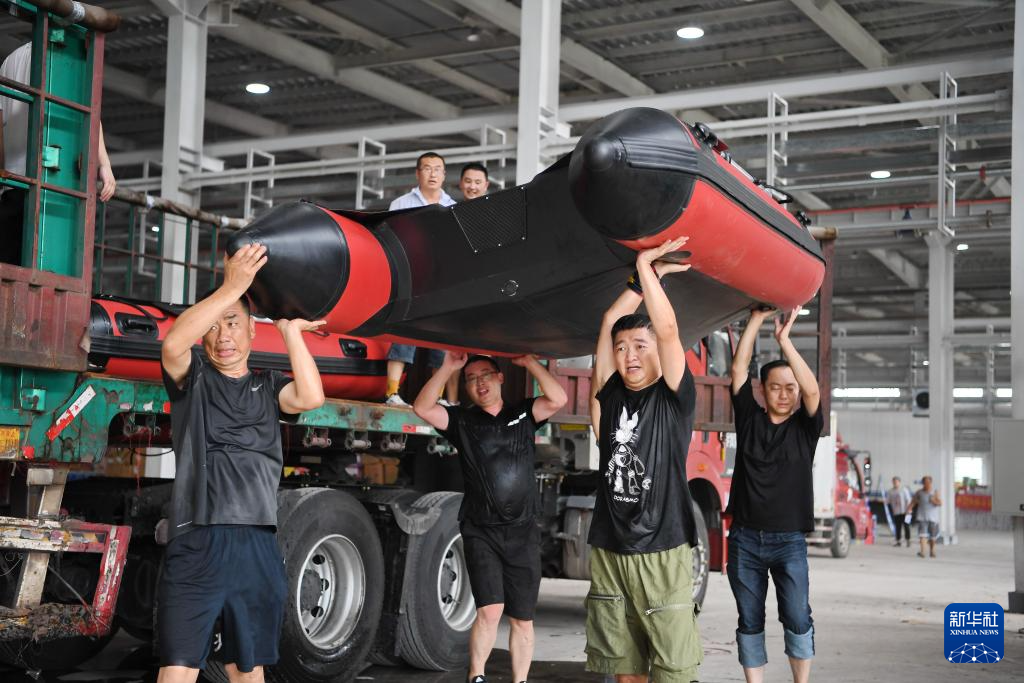 8月5日,工作人员和志愿者在河北省涿州市钢研物资储备点内搬运捐赠的冲锋舟。