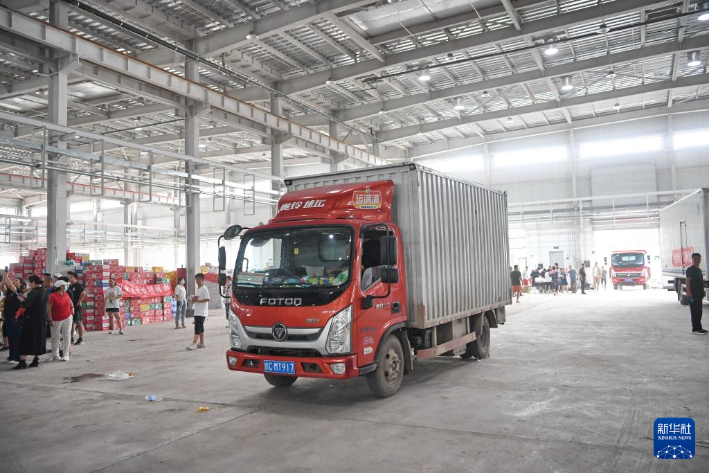 8月5日,捐赠物资的车辆在河北省涿州市钢研物资储备点内行驶。