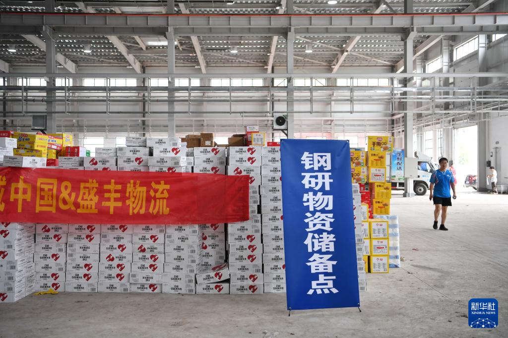 这是8月5日拍摄的河北省涿州市钢研物资储备点内存放的捐赠物资。