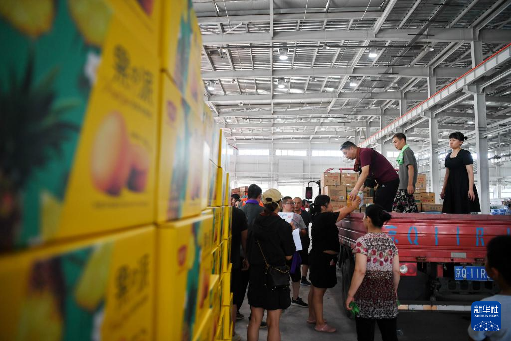 8月5日,中华慈善总会的志愿者在河北省涿州市钢研物资储备点内搬运捐赠物资。