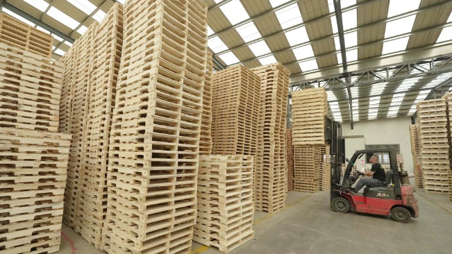 8月20日,工人在唐山市丰南区小集镇钱庄村一家木质包装产品企业的成品库操作叉车码放产品。