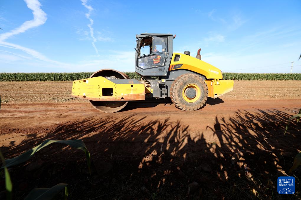 9月20日,工人驾驶机械在河北省石家庄市行唐县南桥镇东市庄村一处连村公路工地施工。