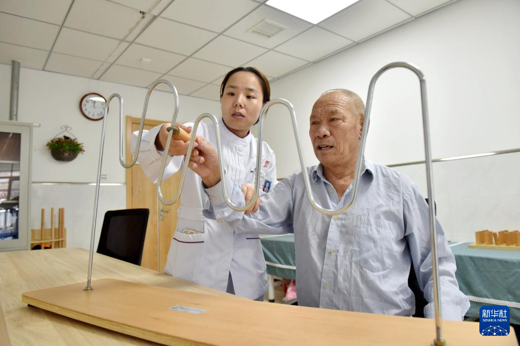 9月26日,邢台市南和区史召乡卫生院医养中心工作人员指导老人进行康复训练。