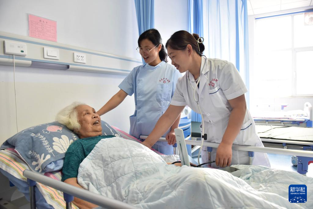 9月26日,邢台市南和区史召乡卫生院医养中心工作人员在养老病房与老人进行交流。