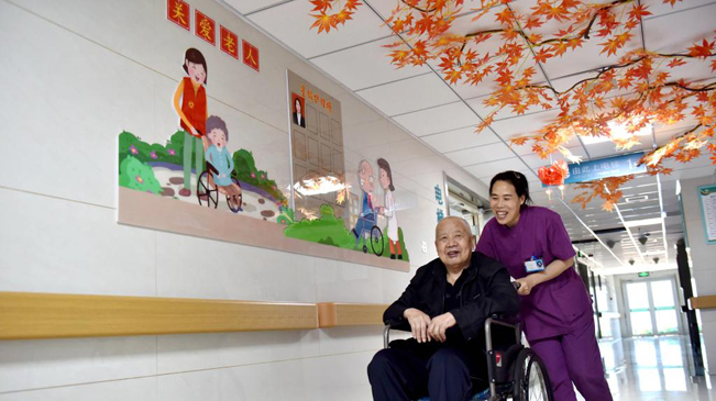 9月26日,邢台市南和区人民医院医养中心工作人员陪老人散心。