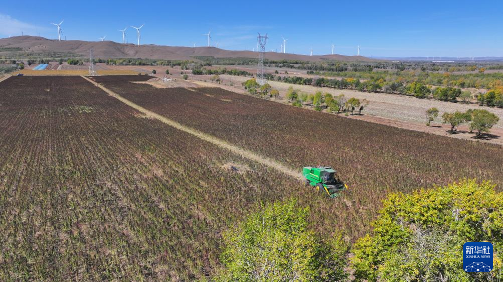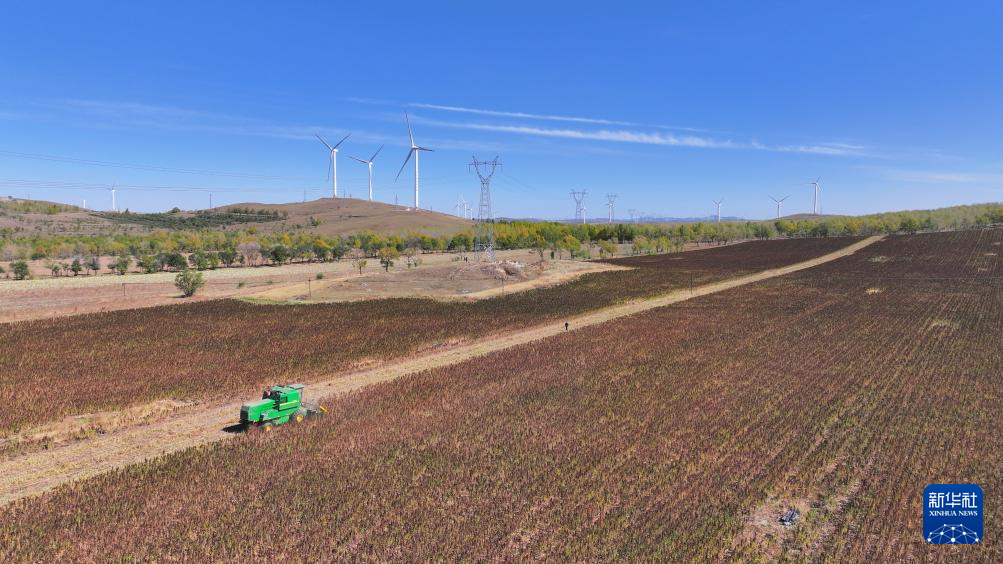 10月1日,在沽源县白土窑乡小西沟村,当地农机手正在田间操作收割机收获藜麦(无人机照片)。