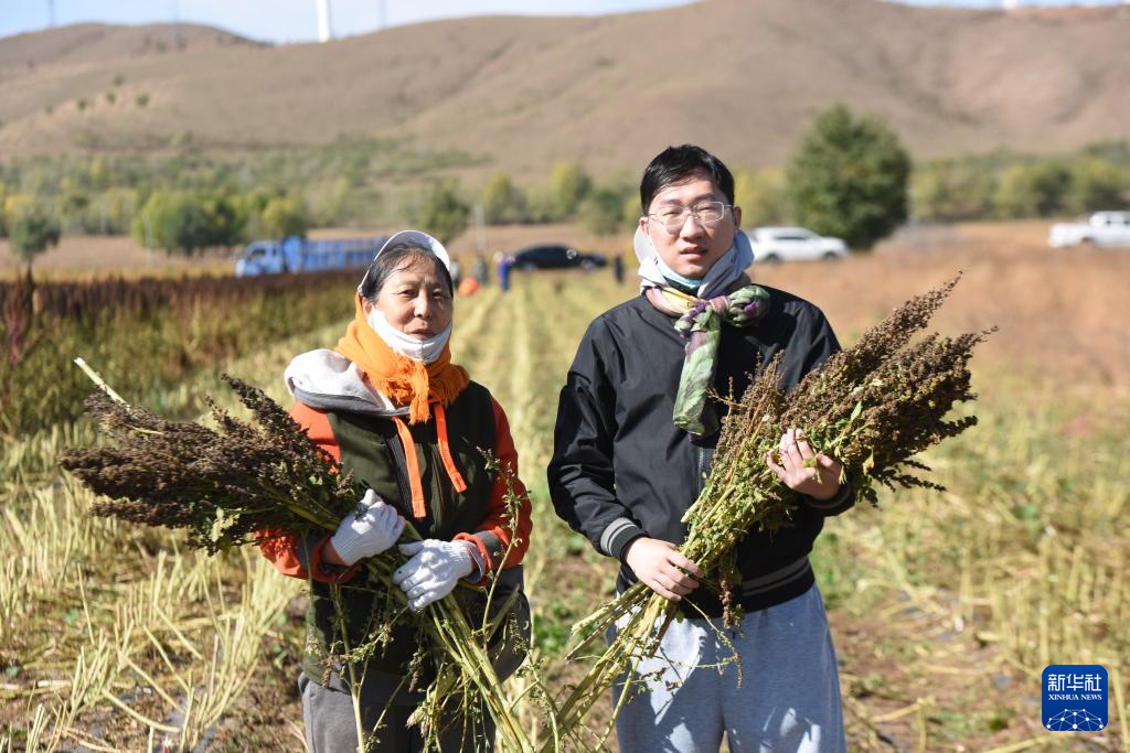 10月1日,在沽源县白土窑乡小西沟村,当地种植户王秀梅和她的儿子赵擎宇抱着收获的红藜麦合影。