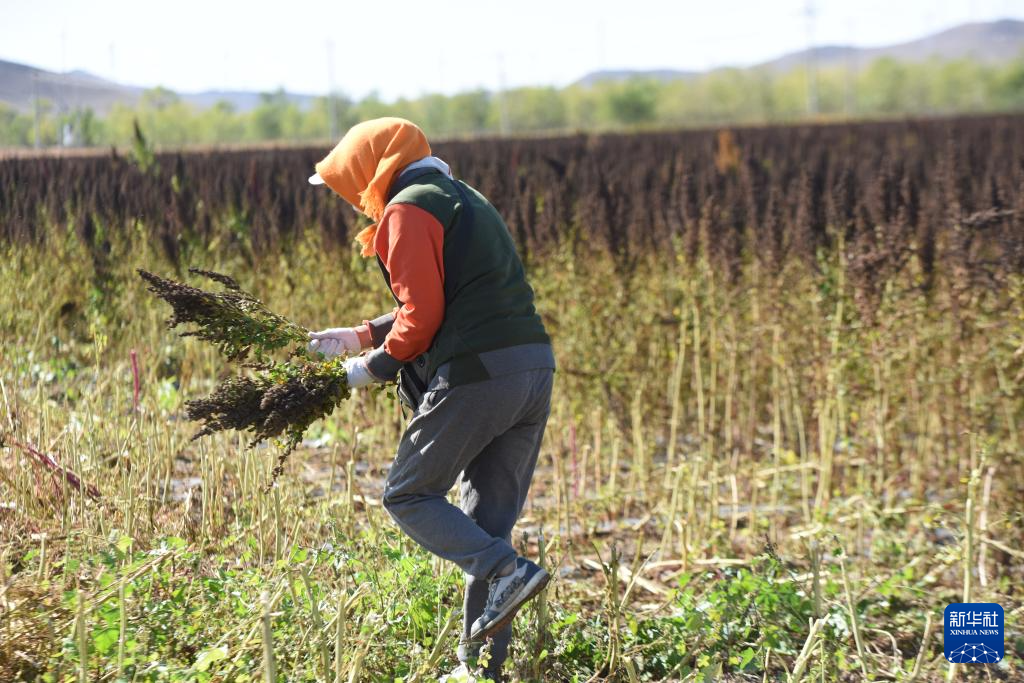 10月1日,在沽源县白土窑乡小西沟村,种植户王秀梅在田间捡拾收割机收割后剩余的藜麦。