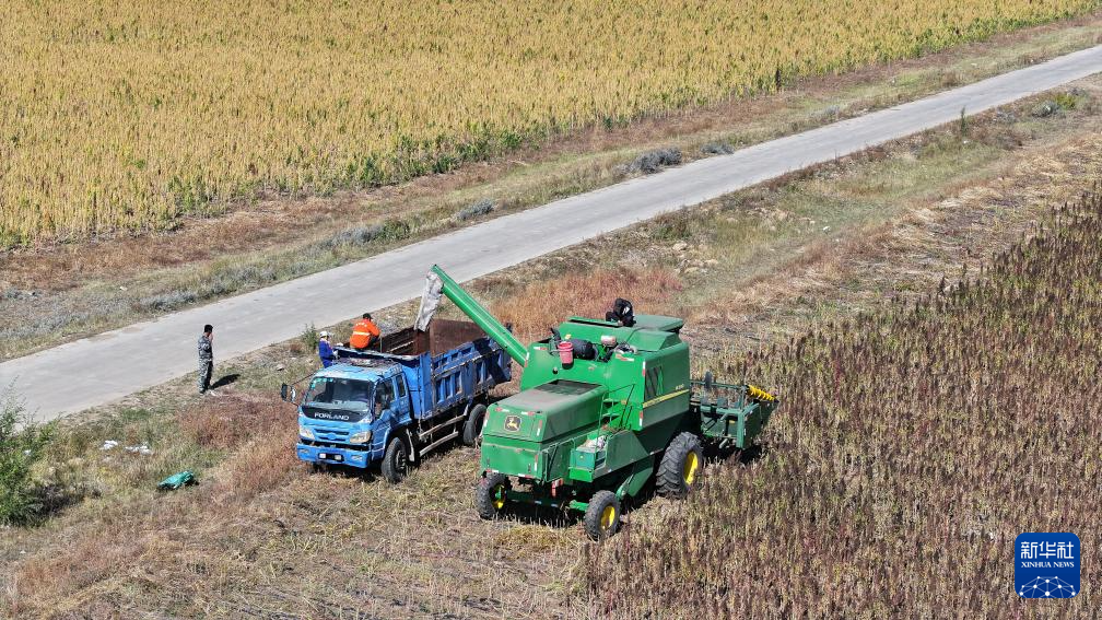 10月1日,在沽源县白土窑乡小西沟村,当地农机手将藜麦装车装备外运(无人机照片)。