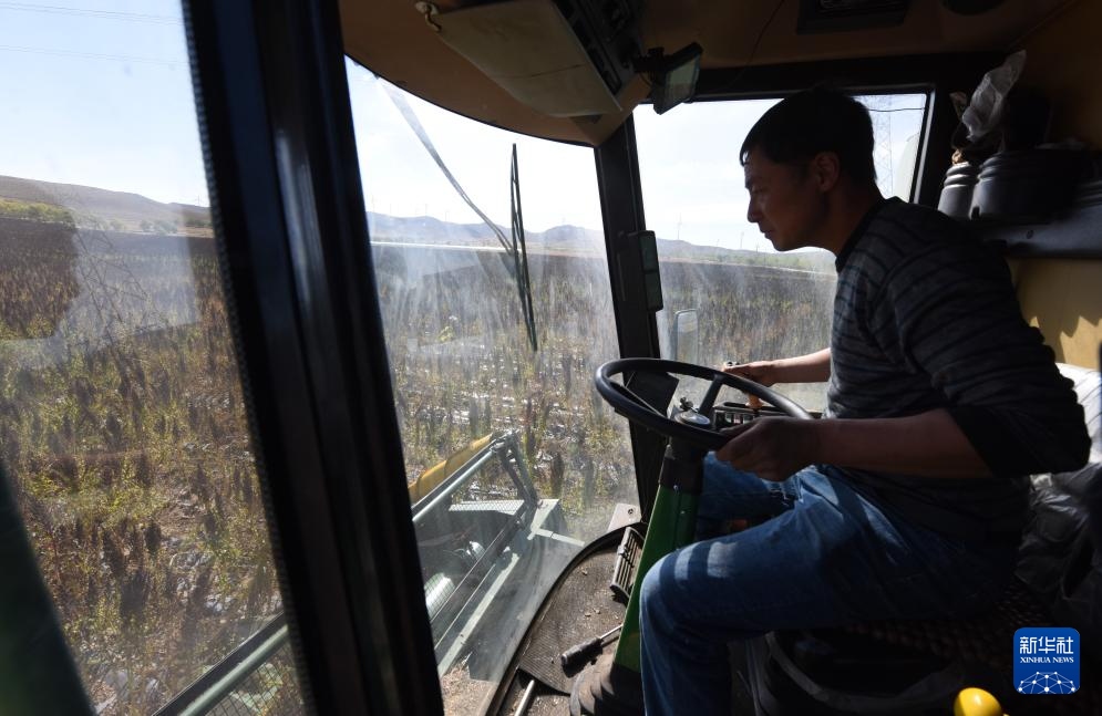 10月1日,在沽源县白土窑乡小西沟村,当地农机手王永成在操作收割机收获藜麦。