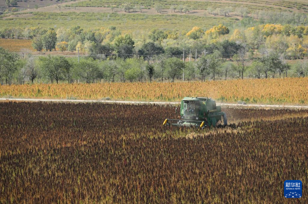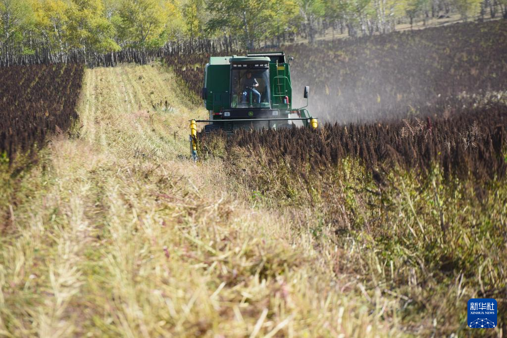 10月1日,在沽源县白土窑乡小西沟村,当地农机手在操作收割机收获藜麦。