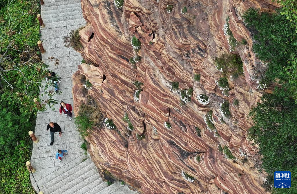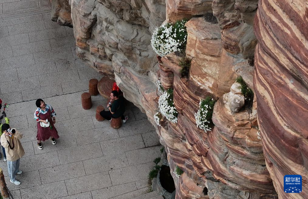 10月2日,游客在河北省武安市西部太行山区拍摄盛开在绝壁上的太行菊(无人机照片)。