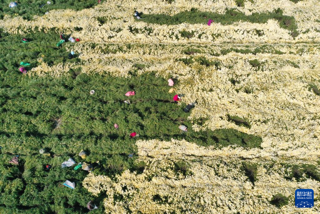 10月22日,临西县西张堤村菊花种植户在采摘菊花(无人机照片)。