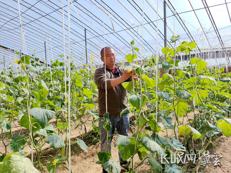 侯东东正在整理黄瓜秧。长城网·冀云客户端记者 祝雪娟 摄