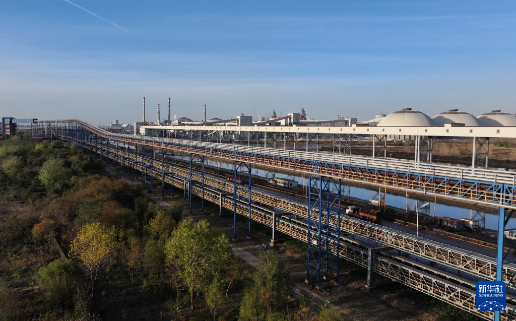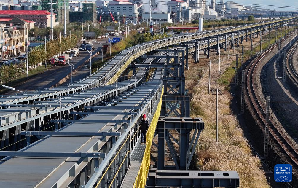 11月12日,车辆从唐山海港经济开发区管带机廊道旁边的公路上通过(无人机照片)。