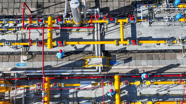 11月16日,位于遵化市的一天然气门站的工作人员在进行设备检测维护工作(无人机照片)。
