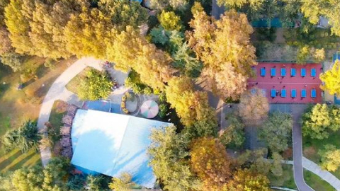 这是一场自然与艺术的交融,一条近1500米的园区主环路道路两旁,400余棵法国梧桐已经进入变色落叶期。它们挺拔的身影在冬日阳光下显得更加高耸,树皮斑驳、叶色斑斓,泛黄的树叶将道路装扮成一条“金色大道”。无论是树枝上还是草坪中,梧桐叶的黄色、红色和绿色交织在一起,勾勒出层林尽染的气势。
