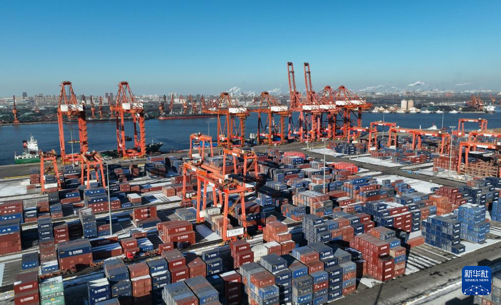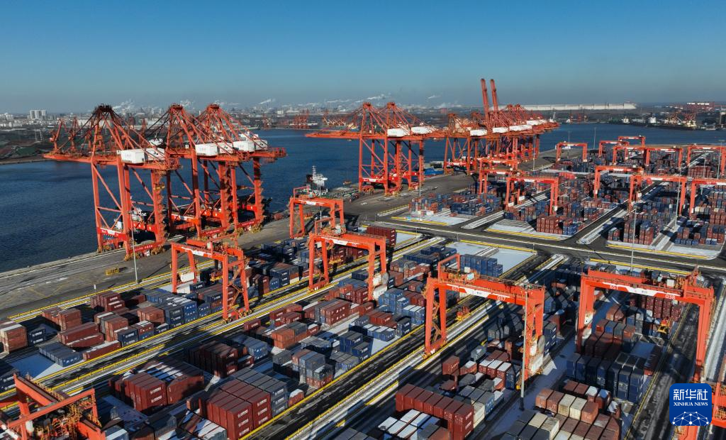 12月21日拍摄的唐山港京唐港区集装箱码头堆场(无人机照片)。