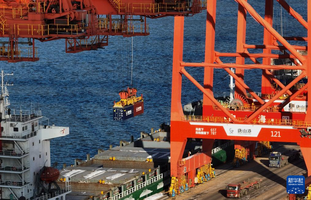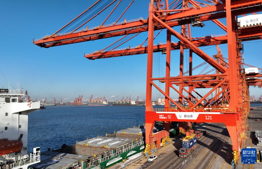 12月21日,一艘轮船靠泊在唐山港京唐港区集装箱码头卸货(无人机照片)。