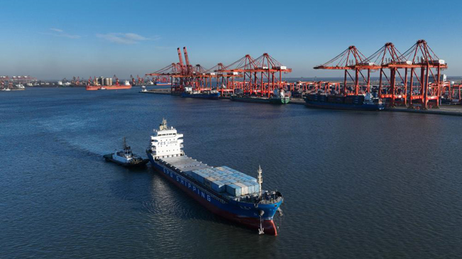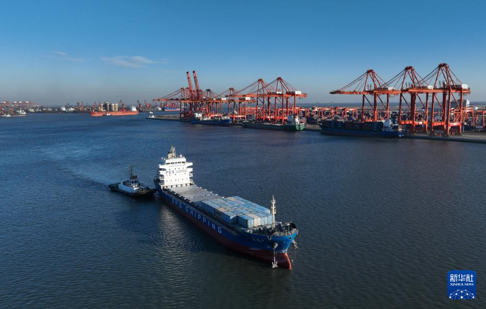 12月21日,一艘轮船在唐山港京唐港区集装箱码头卸载后驶离港区(无人机照片)。