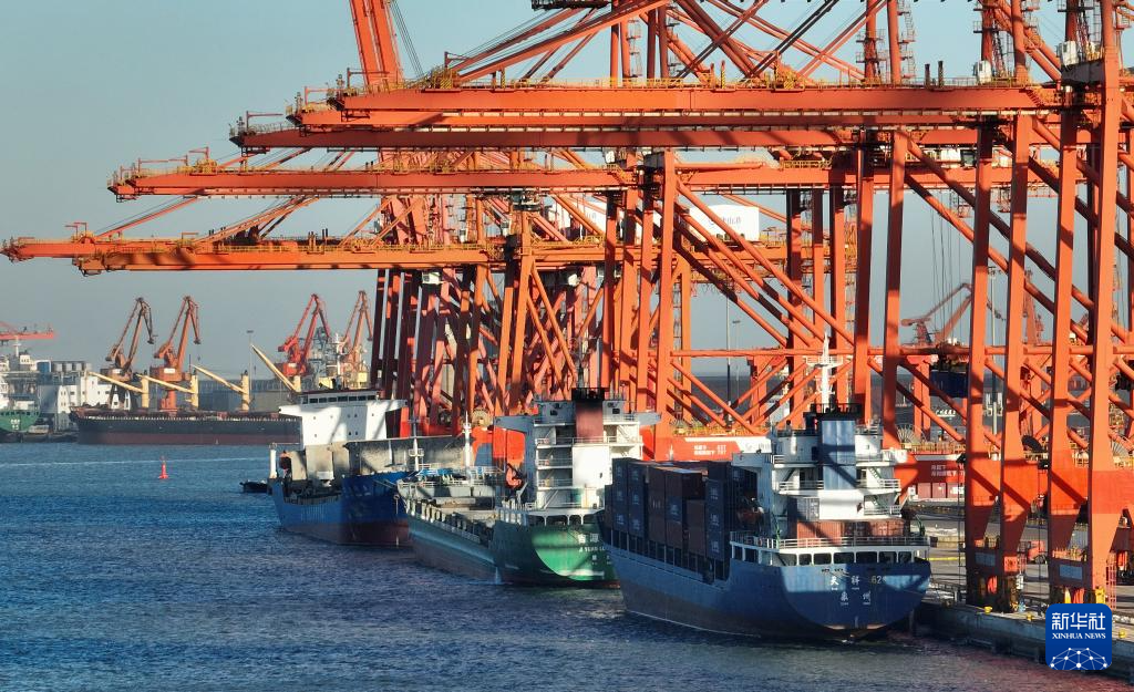 12月21日,三艘轮船靠泊在唐山港京唐港区集装箱码头卸货(无人机照片)。
