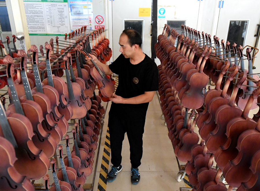 一家乐器企业的工作人员在整理小提琴。贾枭梦 摄