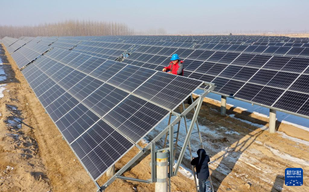 12月28日,工人在河北秦皇岛昌黎县荒佃庄镇附近的一处光伏发电场检修光伏发电板(无人机照片)。
