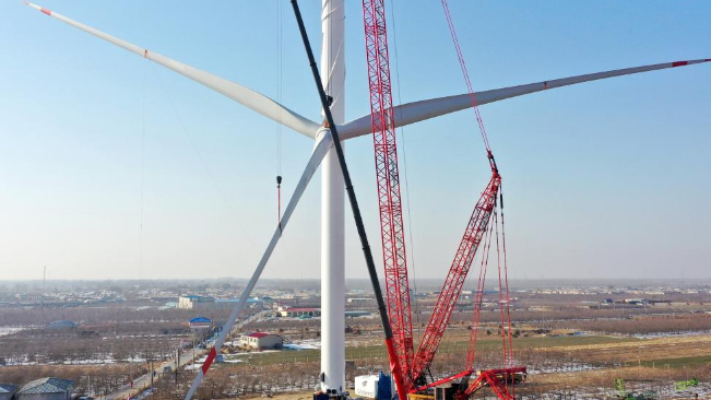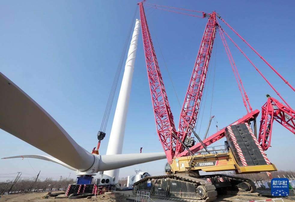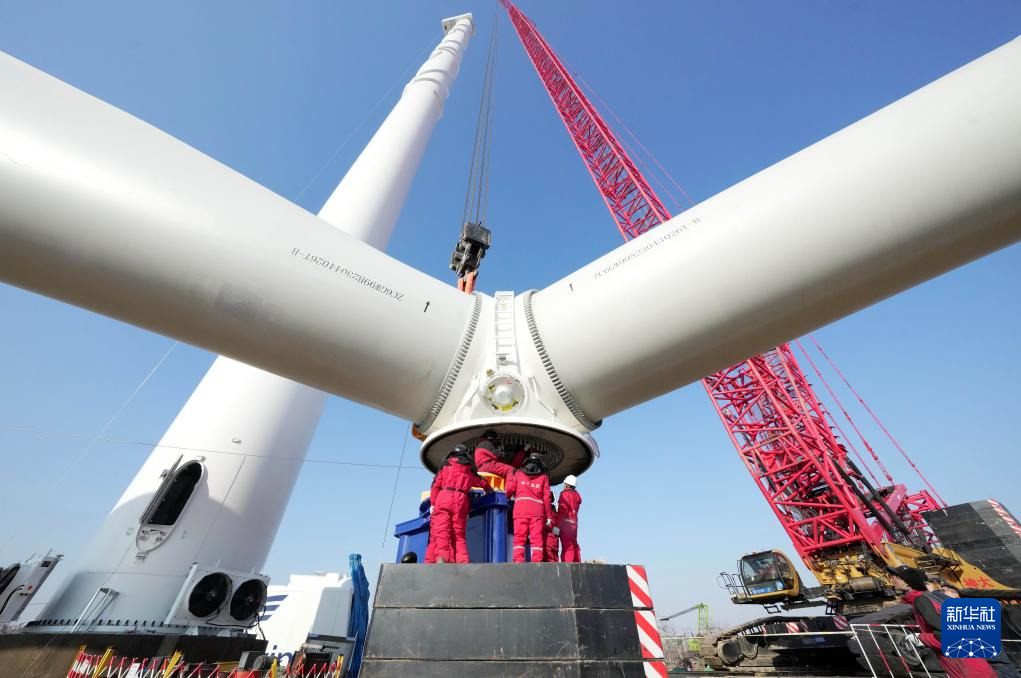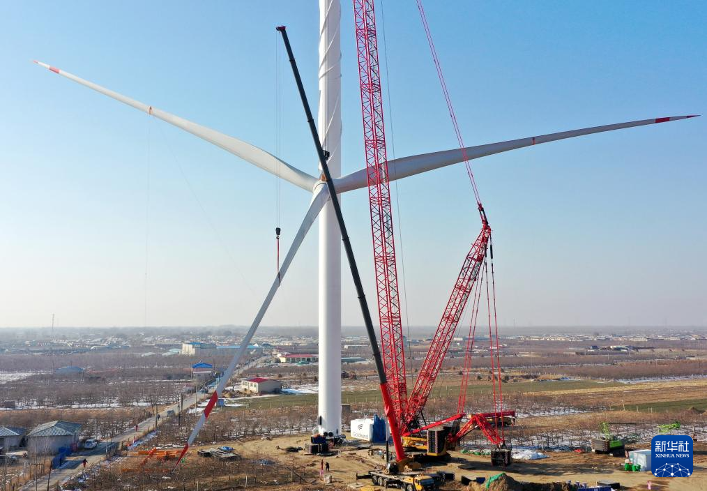 12月28日,工人在河北秦皇岛昌黎县泥井镇前北庄村附近一处建设中的风电场安装风力发电机。