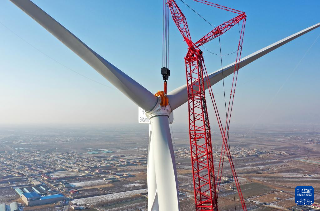 12月28日,工人在河北秦皇岛昌黎县泥井镇前北庄村附近一处建设中的风电场安装风力发电机(无人机照片)。