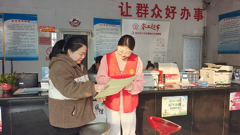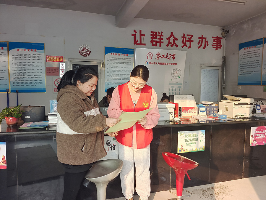 新河县荆庄乡办事大厅的工作人员为办事群众讲解公开办事流程。新河县人民政府办公室供图