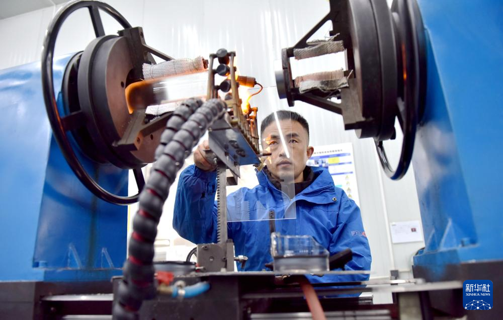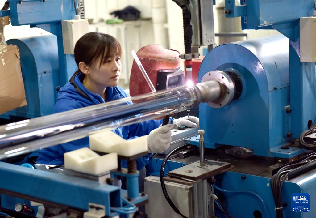 3月11日,工人在威县一家新能源科技企业高温集热管生产线上工作。