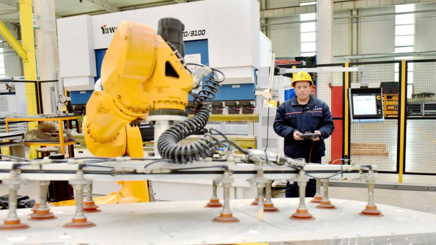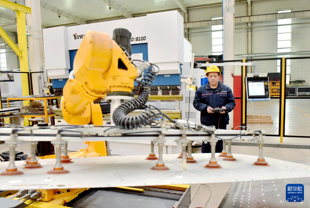 3月11日,在威县高新区的一家电力设备有限公司,工人在操控机械手臂作业。
