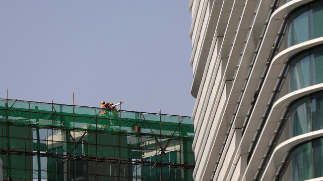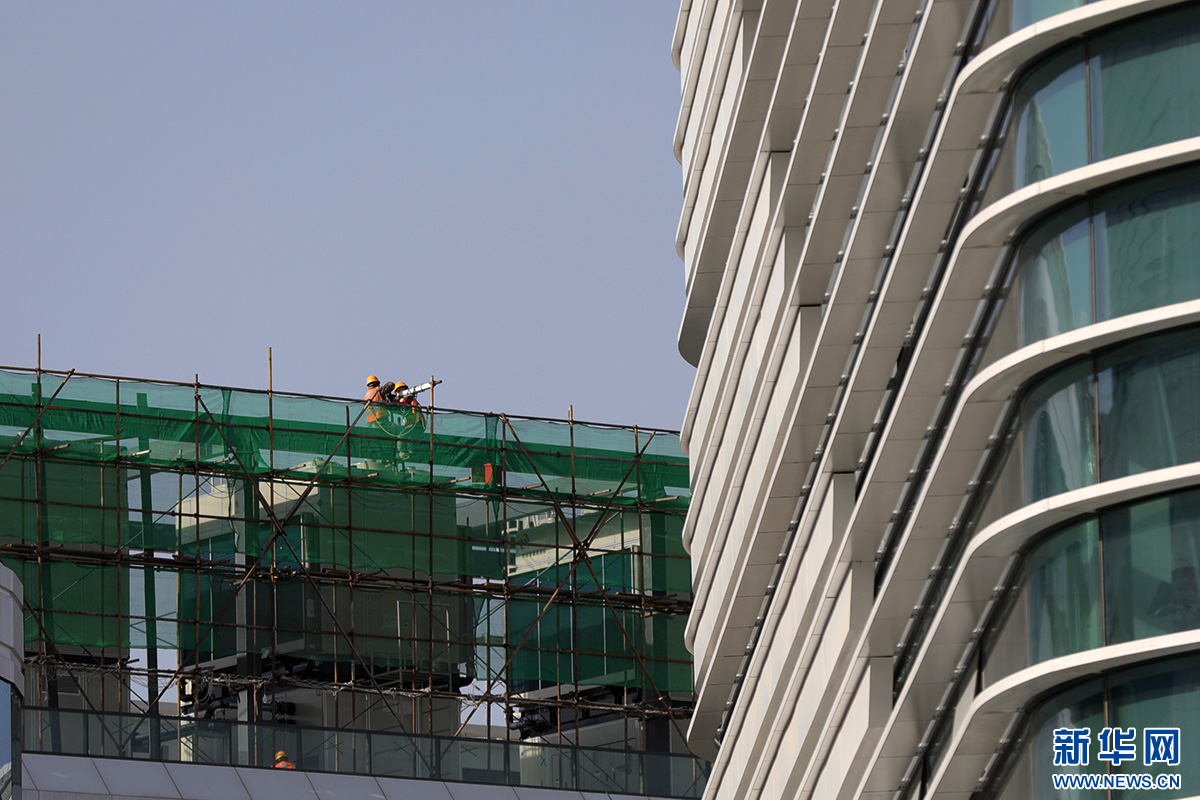 在中国卫星网络集团有限公司雄安新区总部大楼项目建设现场,工人在加紧施工。新华网 王立鹏 摄