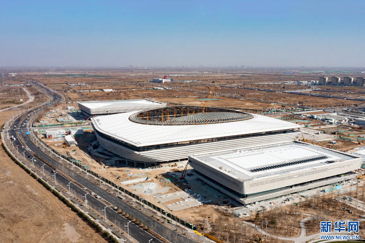 雄安体育中心如同三枚印章印刻在雄安的土地上。新华网 牛思佳 摄