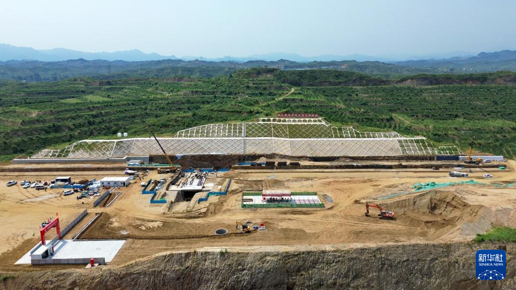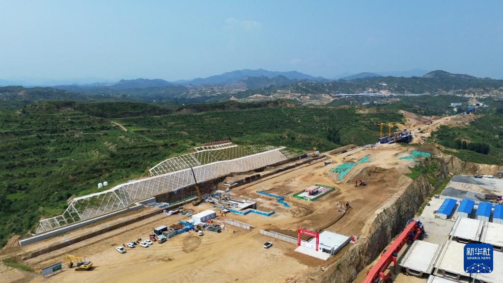 雄忻高铁阜平站建设现场(8月23日摄,无人机照片)。