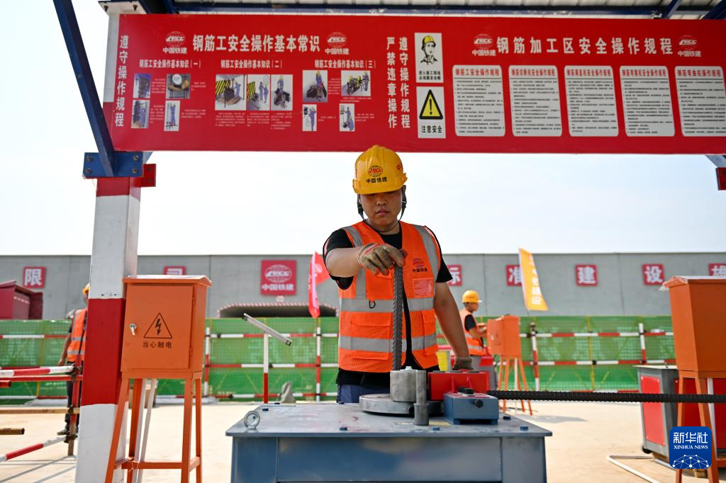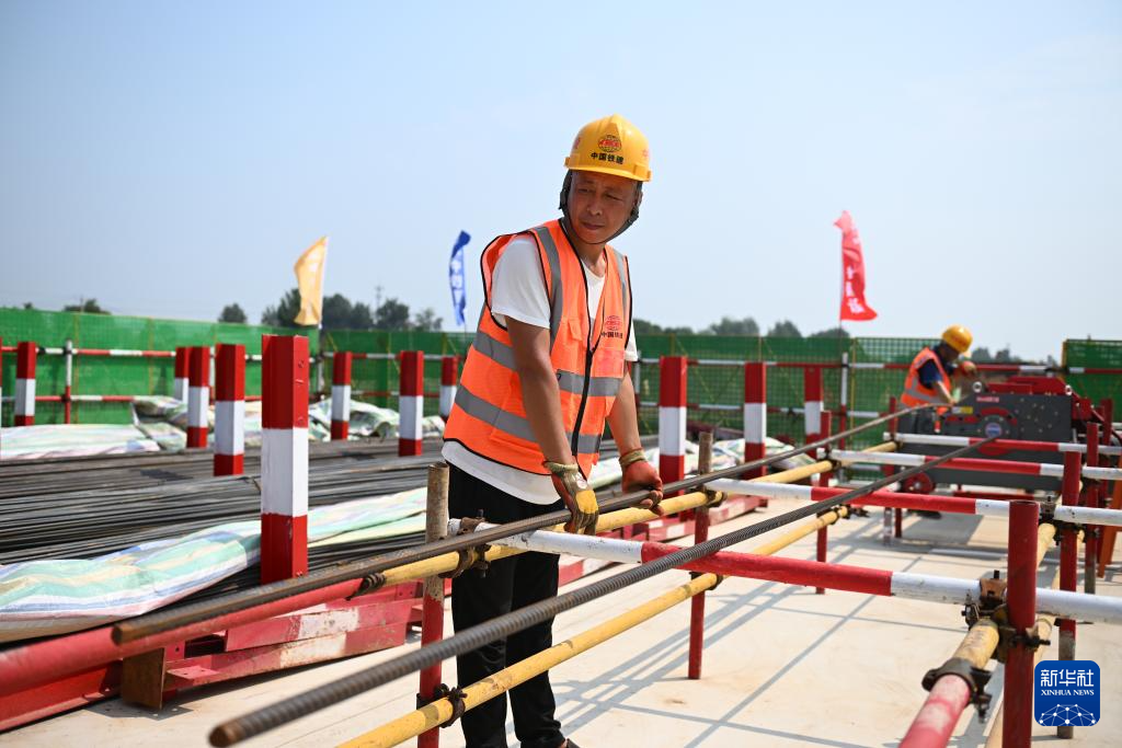 8月23日,中铁建设集团工人在雄忻高铁唐县站建设现场处理钢筋。