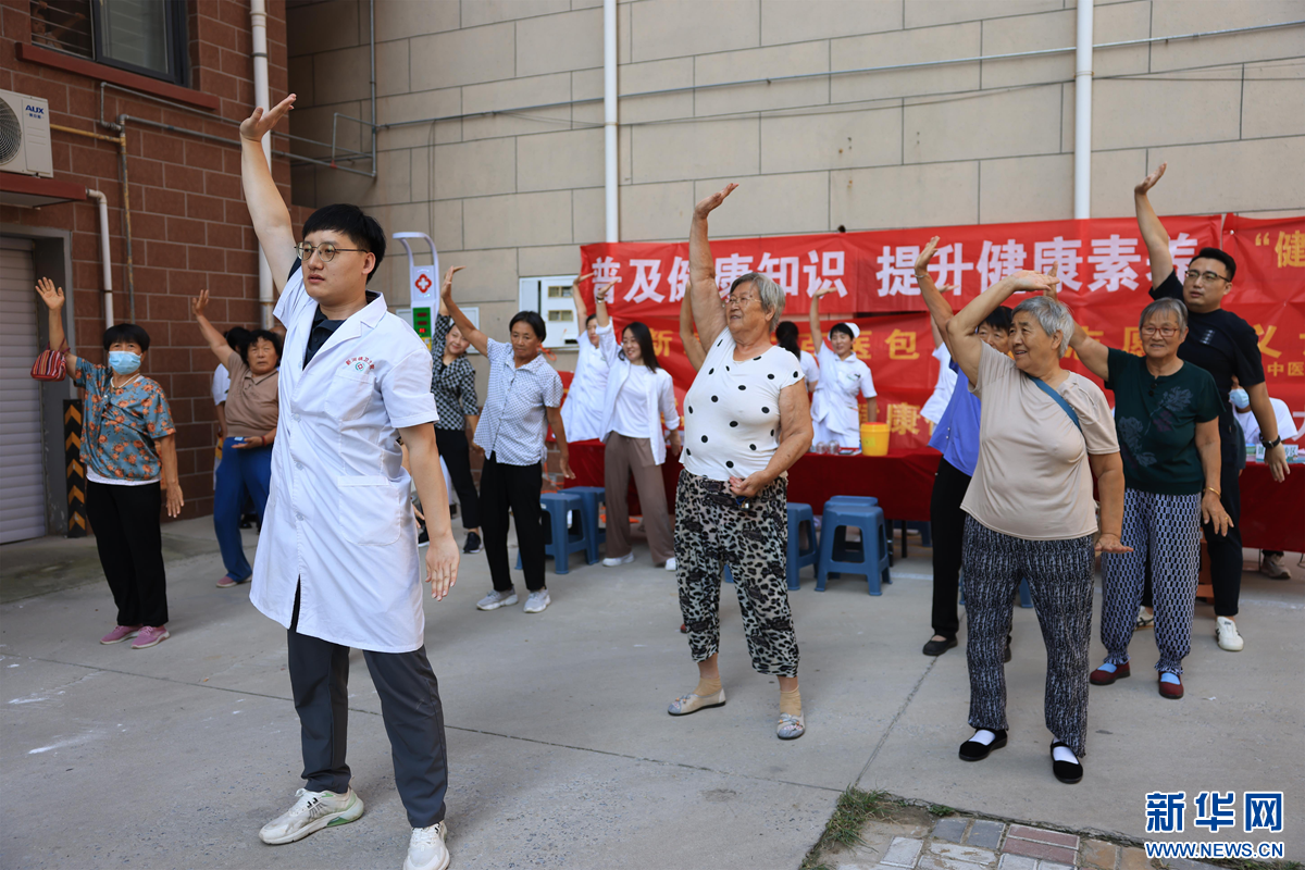 中医医师带领居民学习八段锦保健操。新华网发 李世强 摄